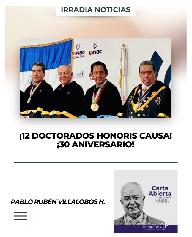 Llegamos al final de la inserción de semblanzas en esta mi Columna, por los que fuimos distinguidos con el otorgamiento del Doctorado Honoris Causa por parte del Claustro Doctoral de la Universidad del Valle de Cuernavaca y la Conferencia Internacional de la Comunidad Universitaria… Merecedores de este Doctorado, también lo fueron el Dr. Aurelio Cruz Valdez, Médico cirujano egresado de la Universidad Autónoma Metropolitana quien tiene Maestría en Salud Pública, realizada en el Instituto Nacional de Salud Pública; Maestría en Ciencias Sociomédicas por la Universidad Nacional Autónoma de México; Doctorado en Ciencias, por el Instituto Nacional de Salud Pública y una especialidad en Infectología Clínica; pertenece al Sistema Nacional de Investigadores de México; actualmente es Subdirector de Apoyo Académico del Centro de Investigación en Salud Poblacional en el Instituto Nacional de Salud Pública; ha sido distinguido como “Morelense de Excelencia” por el Gobierno del Estado de Morelos… Dr. Marcos Fabricio Quintana Pacheco, de origen salvadoreño, fue graduado como Doctor en Medicina en la Universidad de El Salvador; realizó su especialidad en Medicina Interna en el Hospital Nacional San Juan de Dios de Santa Ana en su País; ha cumplido diversos cargos en instituciones de salud y dentro del Ministerio de Salud como Médico Especialista; así mismo se significan sus desempeños en la docencia universitaria como catedrático de diversas instituciones en El Salvador; por sus estudios se significa en varias especialidades científico, académicas y de liderazgo… Lic. Mario Alberto Cabrera Escobar: Realizó sus estudios de Licenciatura en Derecho en la Universidad Autónoma del Estado de Morelos donde posteriormente se desempeñó como Funcionario y Director de la Dirección del Deporte y Actividades de Tiempo Libre; también ejerció como Juez de Paz en el municipio de Totolapan, Morelos, demostrando su compromiso con la justicia y la comunidad; fue fundador del Colegio Stratford y de la Universidad Stratford, institución en la que funge como Vicerrector desde 1990; fue Presidente de la Asociación de Instituciones de Educación Superior Privadas del Estado de Morelos y actualmente es Presidente de la Federación de Universidades Privadas en el Estado de Morelos, desde donde ha promovido el fortalecimiento académico, la calidad educativa y la vinculación social de las instituciones…Mtro. Raúl Vergara Mireles: Es Licenciado en Derecho y Especialidad en Criminalística; en el Gobierno del Estado de Morelos ha cumplido encargos en diferentes áreas del Poder Ejecutivo; fue Coordinador de la Oficina del Presidente Municipal de Cuernavaca; en el Poder Ejecutivo Federal tuvo encargo como Director General de Estrategia Institucional de la Subsecretaría del Trabajo; desde la década de los 80 ha impartido clases en múltiples Universidades como la Universidad del Valle de Cuernavaca, Universidad la Salle, Universidad Americana, Universidad del Colegio Morelos entre otras; durante más de 20 años impartió la materia de Derecho Agrario en la Universidad Autónoma del Estado de Morelos, ocupando además los siguientes encargos: Consejero Técnico, Subdirector y Director de la Facultad de Derecho; Consejero Universitario de la UAEM; ha recibido varias distinciones como el Premio Estatal de Abogados “Antonio Díaz Soto y Gama”; la Venera Lic. Benito Juárez García; Reconocimiento al Mérito Universitario otorgado por el Consejo Universitario de la UAEM; Doctor Honoris Causa por la Universidad Internacional de Negocios y Administración… Se debe destacar la invaluable labor que cumplen y realizan los integrantes del Claustro Doctoral de la UNIVAC que preside el Rector Jorge Arizmendi García junto con Irma Pineda Galindo vicepresidenta; Daniel Alberto Madrid González, Secretario de Ciencias de la Salud; Guadalupe Ángeles Chimal, Secretaria Académica; Julio Cesar Campuzano Rincón Secretario de Estudios Poblacionales; Guillermo Arizmendi García Secretario de Ciencias Sociales; Juan Francisco Molina Rodríguez, Secretario de Sistemas de Salud Global y Planetaria; Arturo Luna Flores, Secretario de Salud Reproductiva Humana, todos ellos relevantes Doctores Honoris Causa… ¡Gracias UNIVAC por esta significada distinción! ¡Hasta mañana que será un día más!