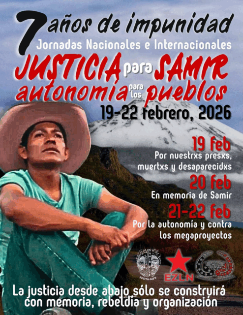 Finalmente, las jornadas proponen una agenda de cuatro días que incluye el registro de víctimas de desaparición forzada, la creación de murales artísticos en honor a Samir y acciones directas contra megaproyectos. Los colectivos interesados tienen hasta el 10 de febrero para registrar sus actividades en el correo oficial del CNI, bajo la premisa de que «la justicia desde abajo solo se construirá con memoria, rebeldía y organización».