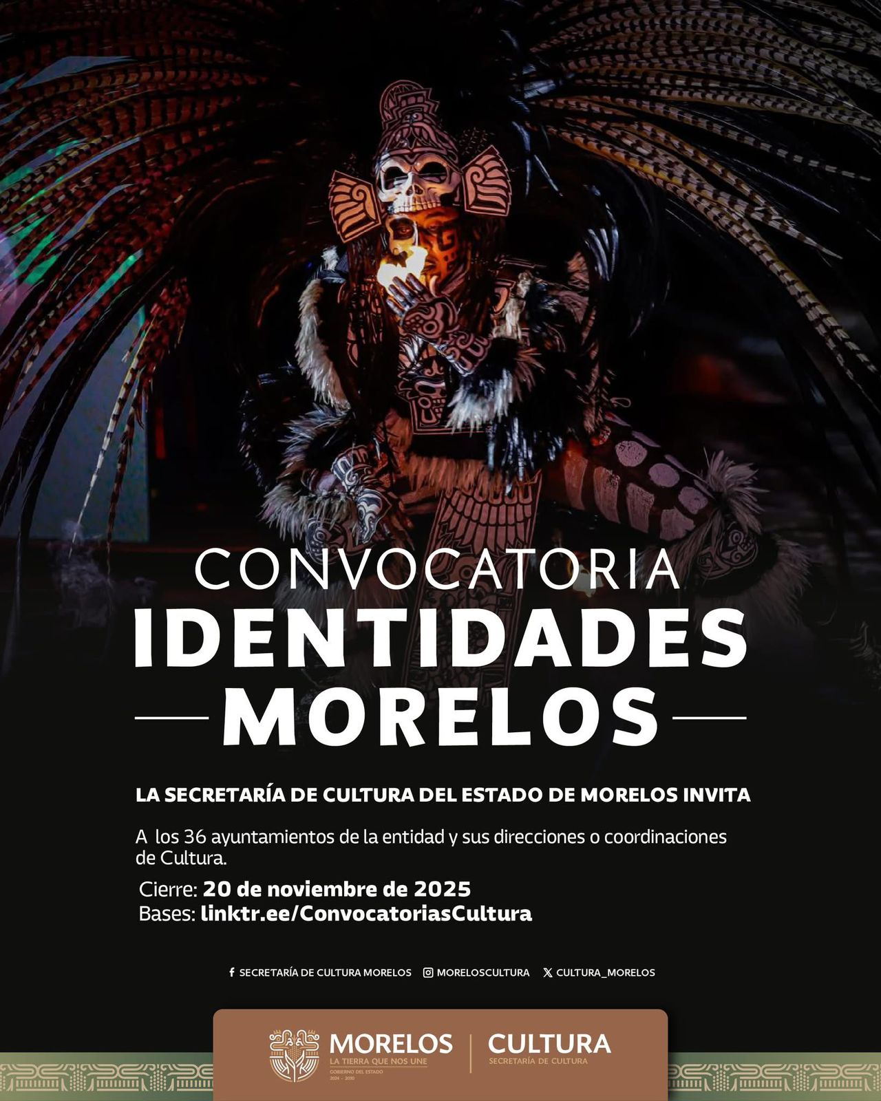 La Secretaría de Cultura del Gobierno de Morelos, “La tierra que nos une”, anunció la apertura de la convocatoria del Programa Social Identidades Morelos, dirigida a los 36 ayuntamientos del estado y sus direcciones o coordinaciones de cultura. A través de esta iniciativa se entregarán 12 apoyos económicos a igual número de municipios para fortalecer la identidad cultural comunitaria y fomentar proyectos locales en tres rubros: talleres de transmisión de saberes, talleres de producción artesanal y expresiones culturales escénicas.