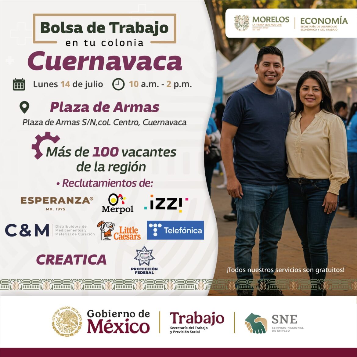 • Del 14 al 18 de julio se llevará a cabo la estrategia “Bolsa de Trabajo en tu Colonia”, en comunidades de Cuernavaca, Xochitepec, Tepalcingo y Zacatepec.