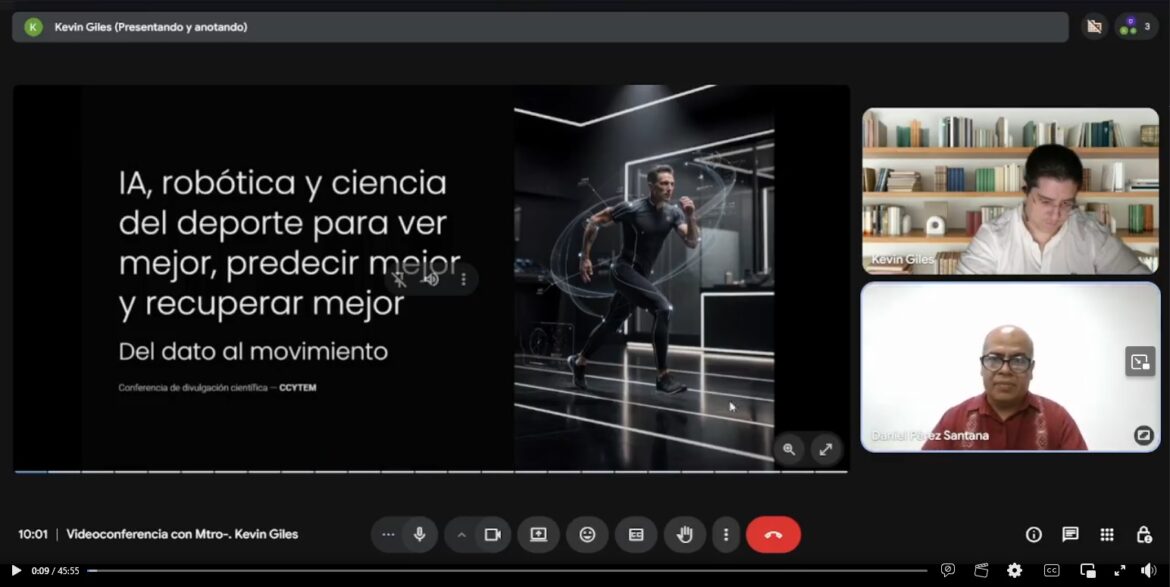 Con el propósito de acercar el conocimiento científico a las juventudes, el Gobierno del Estado de Morelos, a través de la Secretaría de Desarrollo Económico y del Trabajo (SDEyT) y del (CCyTEM) llevó a cabo la transmisión en vivo de la conferencia de divulgación “IA, robótica y ciencia del deporte para ver mejor, predecir mejor y recuperar mejor”.