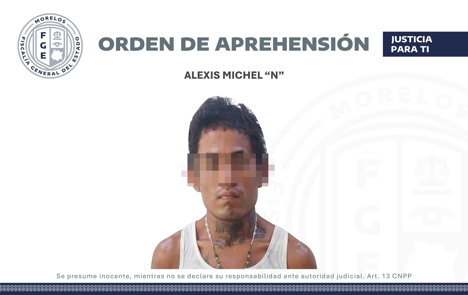 Elementos de la Agencia de Investigación Criminal (AIC) de la Fiscalía Especializada para la Investigación y Persecución del Delito de Feminicidio, ejecutaron una orden de aprehensión en contra de Alexis Michel “N”, requerido por un juez de control por la posible comisión del delito de feminicidio y homicidio calificado.