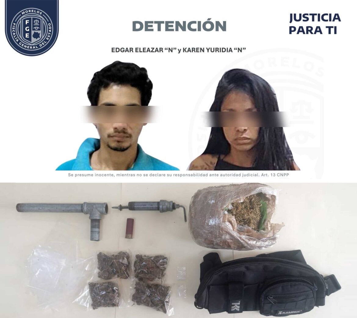 Elementos de la Agencia de Investigación Criminal (AIC) de la Fiscalía Regional Metropolitana detuvieron a Edgar Eleazar “N” y Karen Yuridia “N” en posesión de droga y un arma de fabricación artesanal, tras romper los sellos colocados por un agente del Ministerio Público (MP) especializado e ingresar a un inmueble asegurado en días pasados en un cateo en la colonia Lagunilla de Cuernavaca.