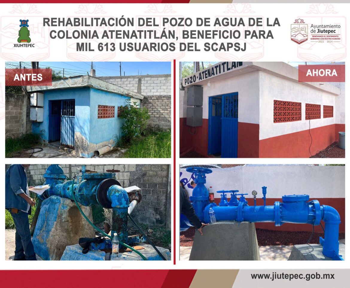 El Sistema de Conservación, Agua Potable y Saneamiento de Agua de Jiutepec (SCAPSJ) invirtió 311 mil pesos, recursos propios, para llevar a cabo la rehabilitación del pozo; entre los trabajos destacan: la sustitución del equipo de bombeo, la rehabilitación de la caseta de controles y de cloración, el mantenimiento del tren del pozo, así como de la barda perimetral.