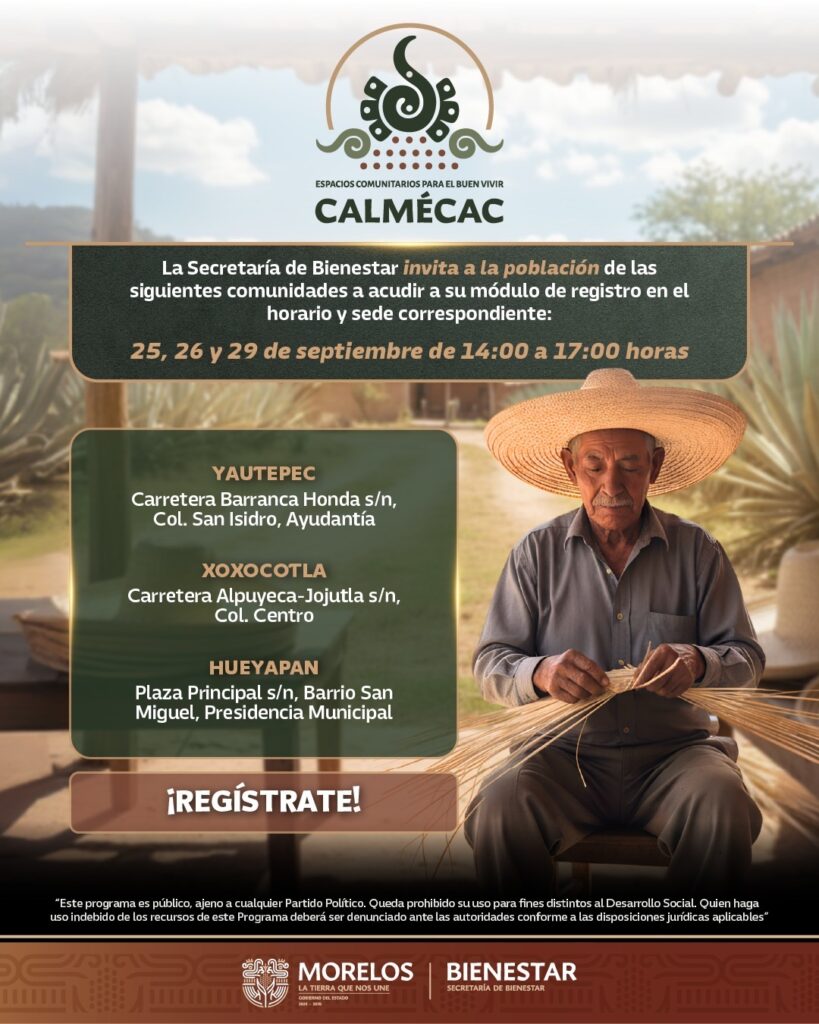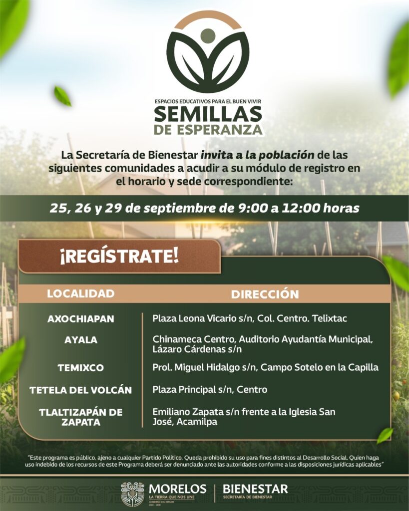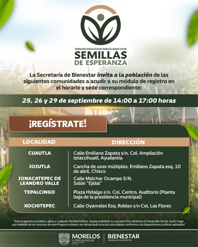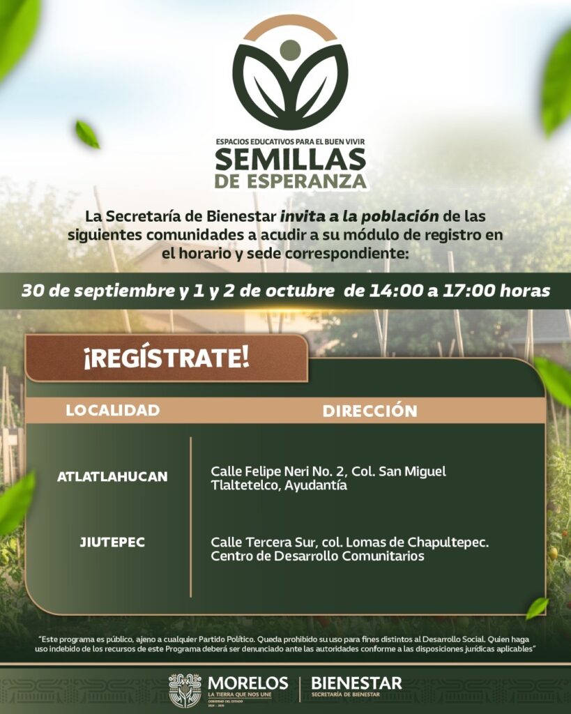 La Secretaría de Bienestar del Gobierno del Estado de Morelos, que encabeza Silvia Salazar Hernández, anunció que a partir del 25 de septiembre iniciarán los registros presenciales a los Programas “Espacios Educativos para el Buen Vivir, Semillas de Esperanza” y “Espacios comunitarios para el buen vivir, Calmecac”.