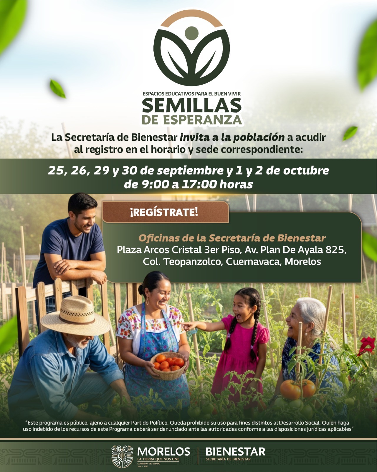 El “Programa Espacios Educativos para el Buen Vivir, Semillas de Esperanza” tiene el objetivo de fortalecer la cultura ambiental y la participación comunitaria mediante centros educativos y sociales vinculados a huertos de traspatio con enfoque comunitario.