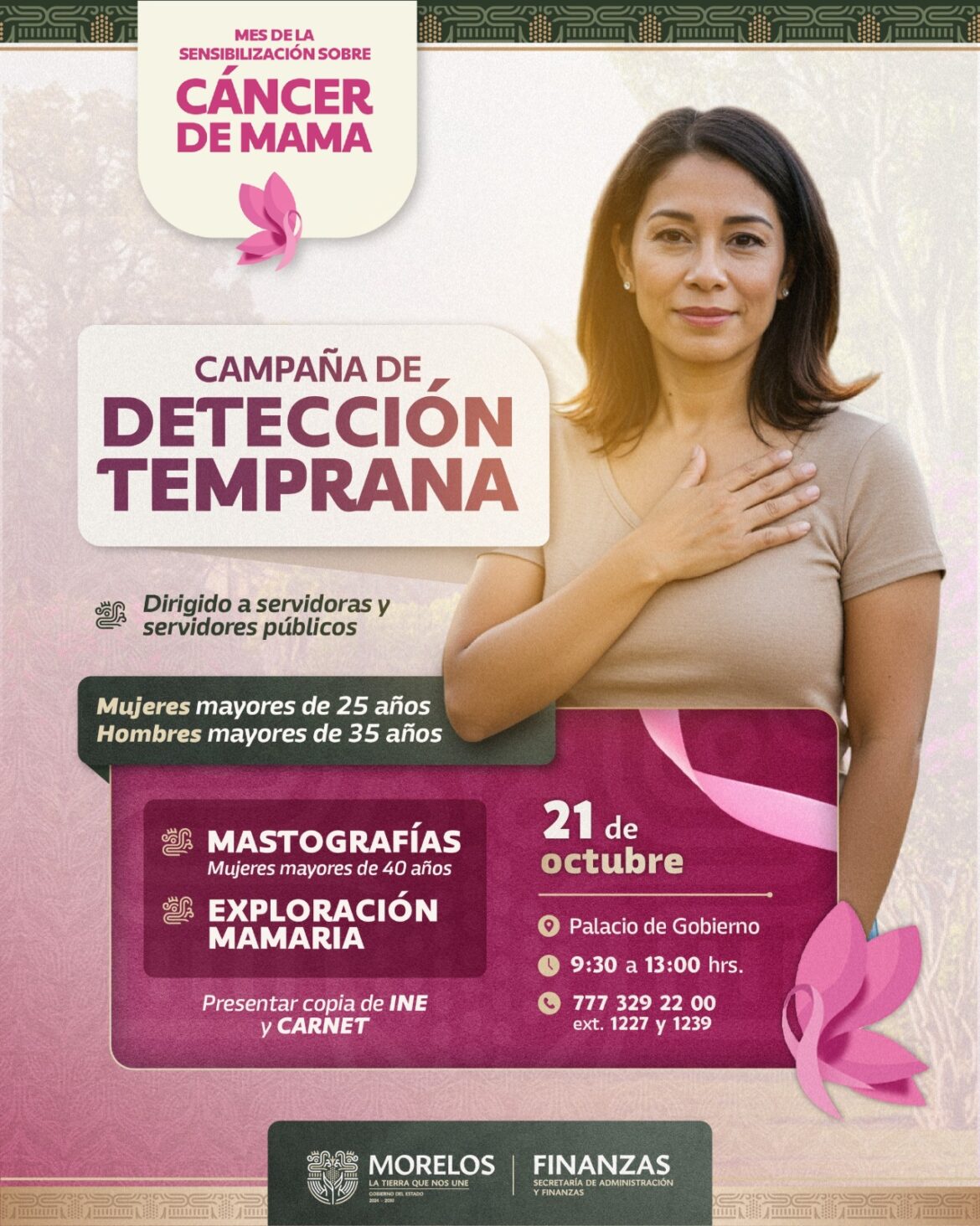 En el marco del mes de la sensibilización sobre el Cáncer de Mama, la Secretaría de Administración y Finanzas, a través de la Dirección General de Recursos Humanos, llevará a cabo el próximo 21 de octubre una campaña de detección temprana, dirigida a las y los servidores públicos del Gobierno de Morelos.