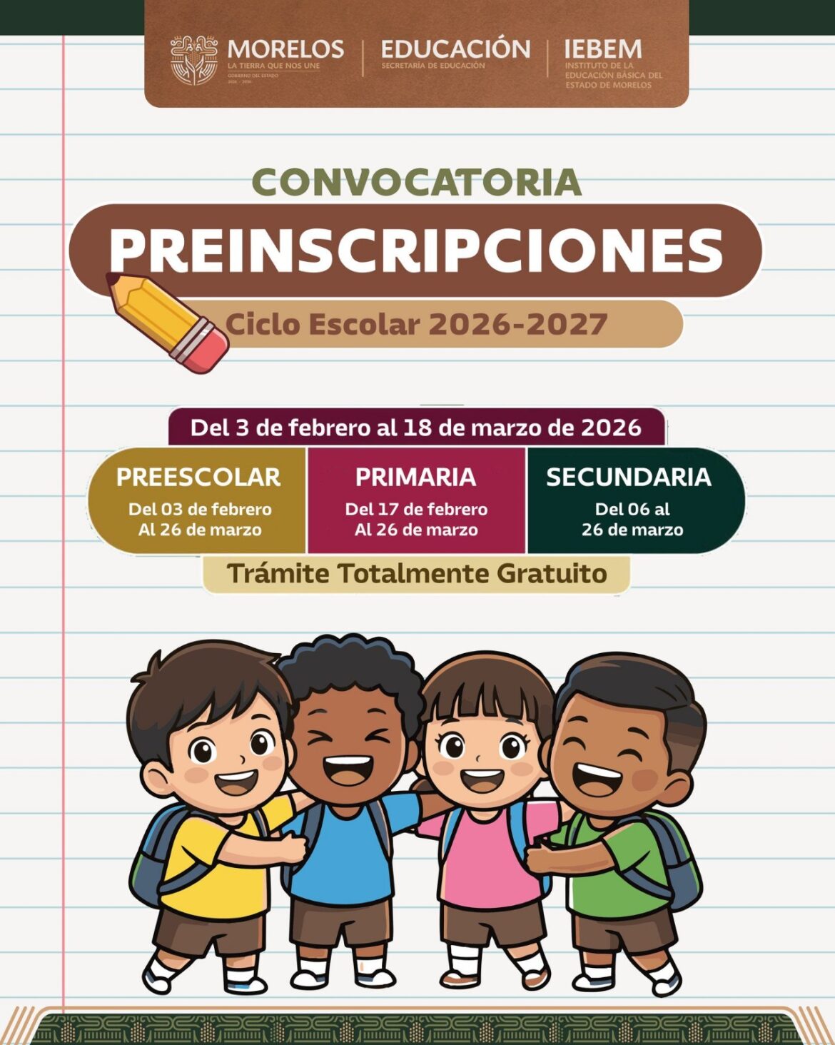 El Instituto de la Educación Básica del Estado de Morelos (IEBEM) publicó la Convocatoria del Proceso de Preinscripciones por Internet para el Ciclo Escolar 2026-2027, dirigido a niñas, niños y adolescentes que ingresarán al nivel preescolar, primer grado de educación primaria o a primero de secundaria en escuelas públicas de la entidad.