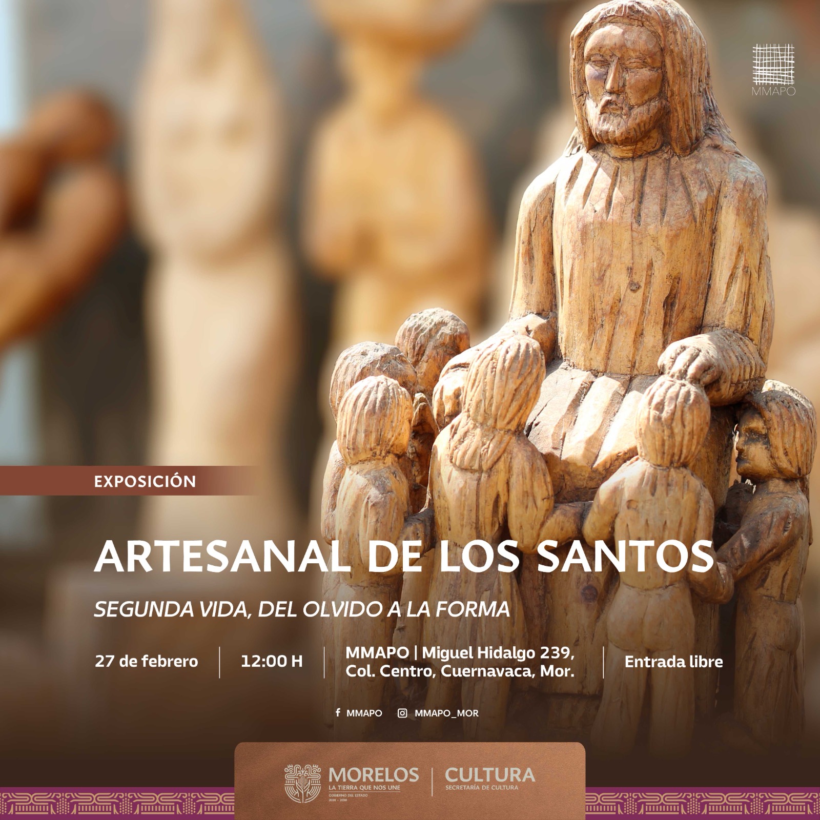 La Secretaría de Cultura del Gobierno de Morelos, “La tierra que nos une”, inaugurará la exposición temporal “Artesanal de los Santos. Segunda vida, del olvido a la forma”, del maestro Francisco Puebla de los Santos, que se llevará a cabo el 27 de febrero a las 12:00 horas, en la Sala Guillermo Helbling Petrini del Museo Morelense de Arte Popular (MMAPO), con el propósito de reconocer y difundir el talento artesanal del estado.