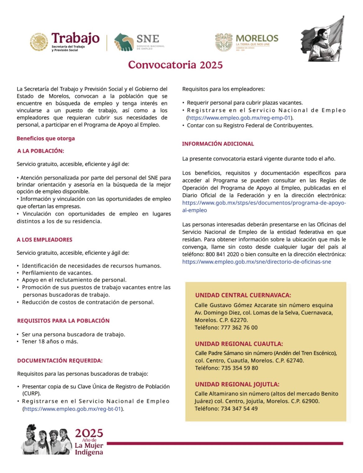 Con el compromiso de fortalecer el desarrollo económico y laboral en el estado, la Secretaría de Desarrollo Económico y del Trabajo (SDEyT), a través del Servicio Nacional de Empleo Morelos (SNE), anuncia la convocatoria del Programa de Apoyo al Empleo 2025 (PAE), cuyo objetivo es facilitar el acceso a empleos formales a personas mayores de 18 años, mejorando sus oportunidades laborales y su bienestar.