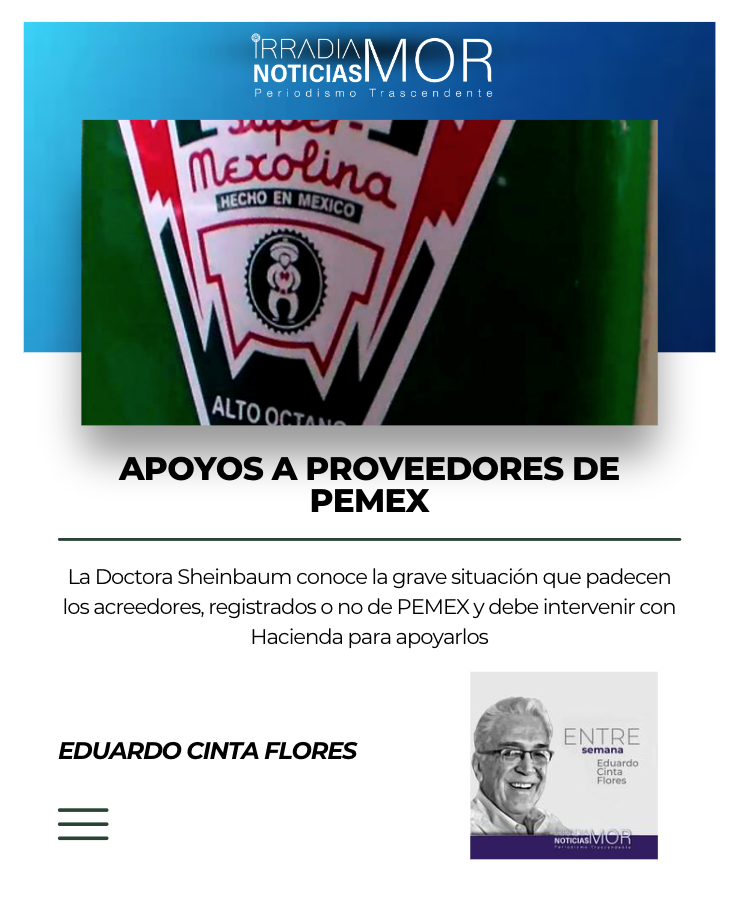 La Doctora Sheinbaum conoce la grave situación que padecen los acreedores, registrados o no de PEMEX y debe intervenir con Hacienda para apoyarlos y sostener a los verdaderos empresarios que pueden sacar adelante al Charrito PEMEX. Hace años sentíamos orgullo al ver la estampa del cazcorvo en las bombas de gasolina, hoy lejos de sentir tristeza se siente coraje que mejor se invierta en proyectos … sin futuro.