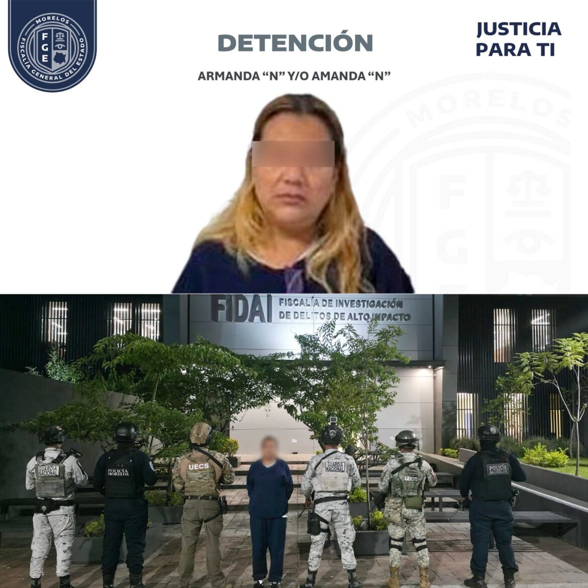 Gracias a la colaboración interinstitucional de la Fiscalía General del Estado (FGE) de Morelos con autoridades federales, elementos de la de la Fiscalía de Investigación de Delitos de Alto Impacto (FIDAI) cumplimentaron orden de aprehensión en contra de Armanda y/o Amanda “N”, por la probable comisión del delito de secuestro agravado, suscitado en el 2021 en el municipio de Yecapixtla.