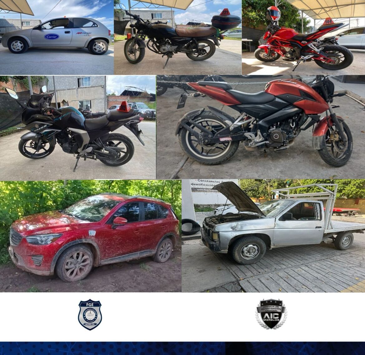 En el municipio de Temixco, los agentes investigadores recuperaron tres motocicletas de las marcas Bajaj, Italika y Yamaha, respectivamente, las cuales presentaron alteraciones en sus números de identificación.