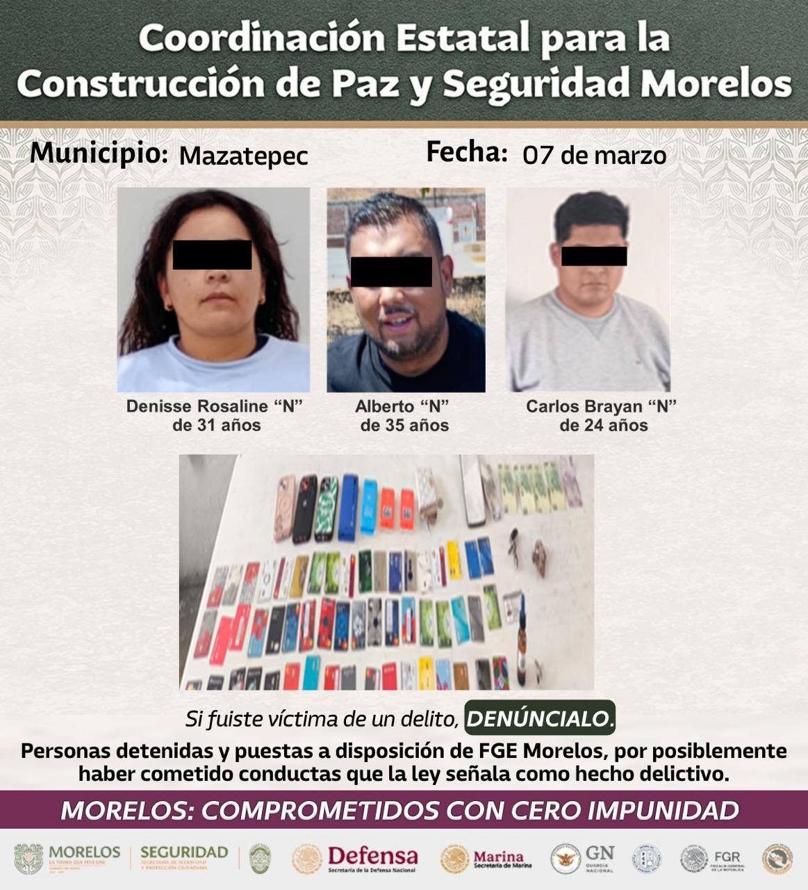 Como resultado de un operativo interinstitucional, autoridades de seguridad aseguraron a tres personas en el municipio de Mazatepec por su probable participación en el delito de posesión ilícita de tarjetas de débito y crédito.