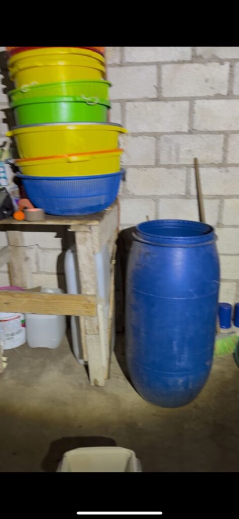 17. Dosis químicas por identificar, una estufa industrial con diversas ollas azules, recipientes de plástico de 200 y 100 litros y tambos medianos que podrían ser utilizados para la elaboración artesanal de droga sintética.