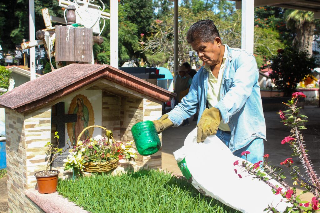 De manera simultánea personal operativo del Ayuntamiento de Jiutepec realiza trabajos de limpieza, mantenimiento y rehabilitación de los espacios de descanso en el municipio en la víspera del día de muertos.