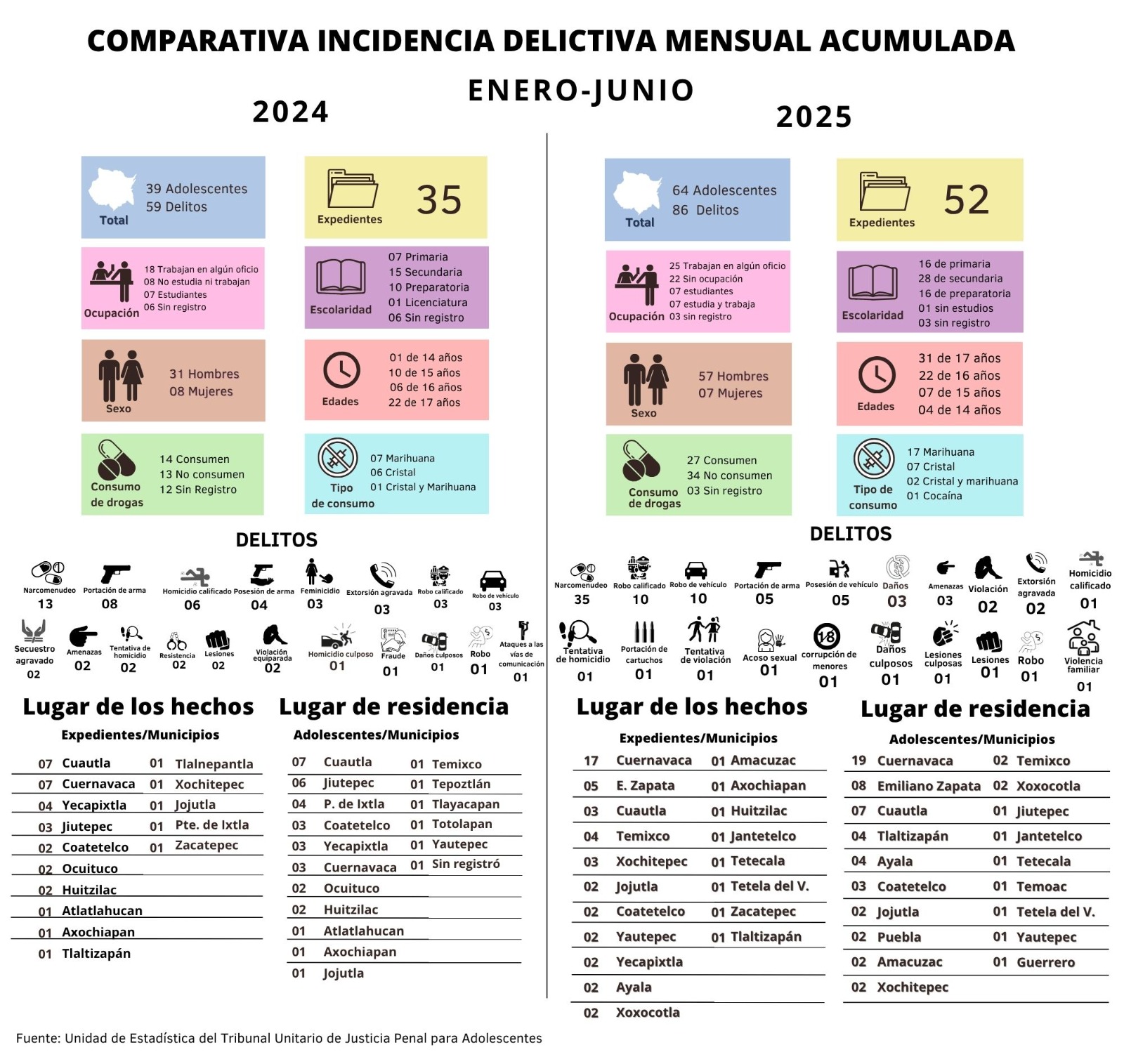El Tribunal Unitario de Justicia Penal para Adolescentes (TUJPA) informa que, durante el primer semestre de 2025, se registraron 52 expedientes relacionados con 64 adolescentes y 86 conductas ilícitas investigadas. En comparación con el mismo periodo del año anterior, esto representa un incremento del 67 % en expedientes, 61 % en personas adolescentes y 69 % en conductas delictivas.
