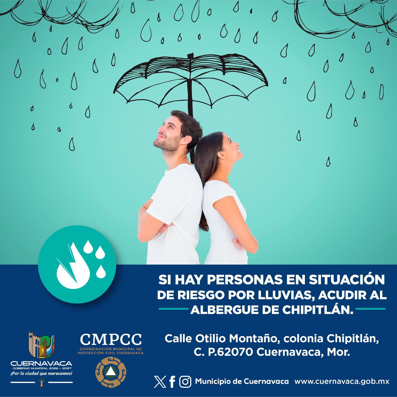El Ayuntamiento de Cuernavaca reitera su llamado a la ciudadanía para que, en caso de ser necesario, se trasladen al albergue temporal ubicado en la Ayudantía Municipal de Chipitlán, con el objetivo de resguardarse y evitar posibles afectaciones a su seguridad, debido a las lluvias que se esperan durante el fin de semana.