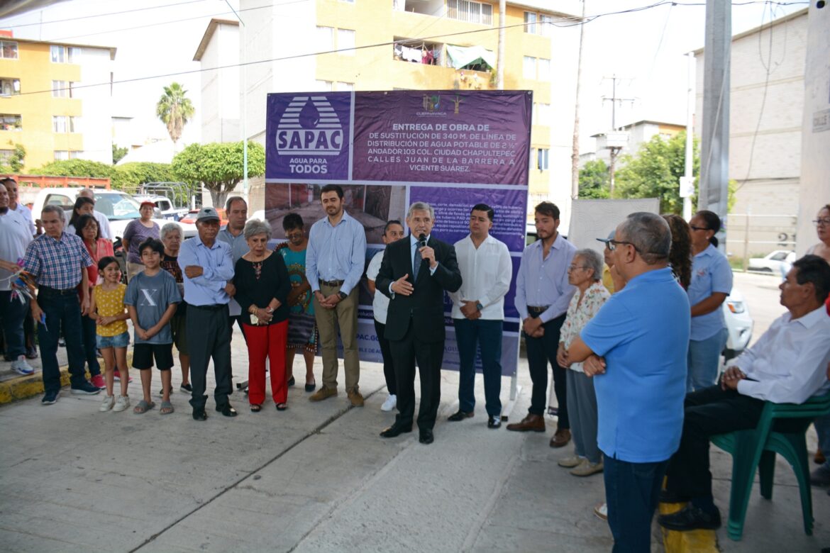 El presidente municipal de Cuernavaca, José Luis Urióstegui Salgado, acompañado de la directora general del Sistema de Agua Potable y Alcantarillado de Cuernavaca (SAPAC), Evelio Flores Hernández, entregó este martes la obra de sustitución de 340 metros de la línea de distribución de agua potable de dos 1/2 pulgadas en Andador 103 de la colonia Ciudad Chapultepec que garantizará un mejor consumo del agua potable a más de dos mil personas, al evitar problemáticas que constantemente se presentaban en la zona como su desperdicio y contaminación por la antigüedad de la red.