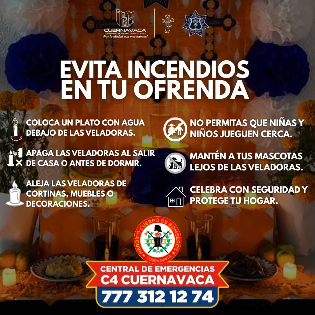 La Dirección de Bomberos, Rescate y Urgencias Médicas de la Secretaría de Protección y Auxilio Ciudadano (SEPRAC) exhorta a la ciudadanía a tomar medidas preventivas al colocar sus ofrendas durante las celebraciones de Día de Muertos, con el objetivo de evitar incidentes por el uso de veladoras encendidas dentro de los hogares.