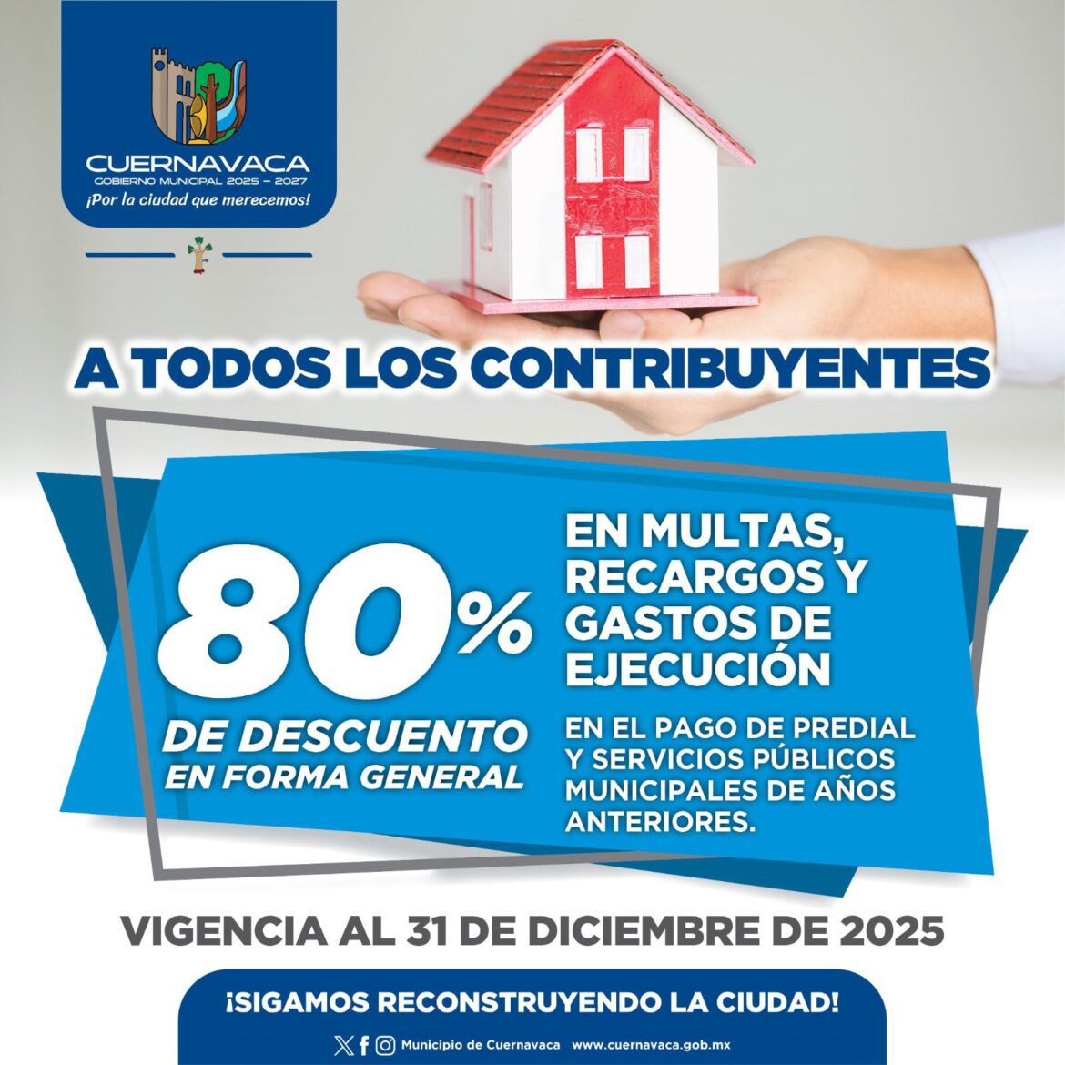 Con el objetivo de apoyar la economía de los contribuyentes y al mismo tiempo fortalecer la recaudación municipal, el Cabildo del Ayuntamiento de Cuernavaca, presidido por el alcalde José Luis Urióstegui Salgado, aprobó la aplicación de un estímulo fiscal de hasta un 80% en multas y recargos en el pago del impuesto predial y servicios públicos municipales, vigente hasta el 31 de diciembre de 2025.