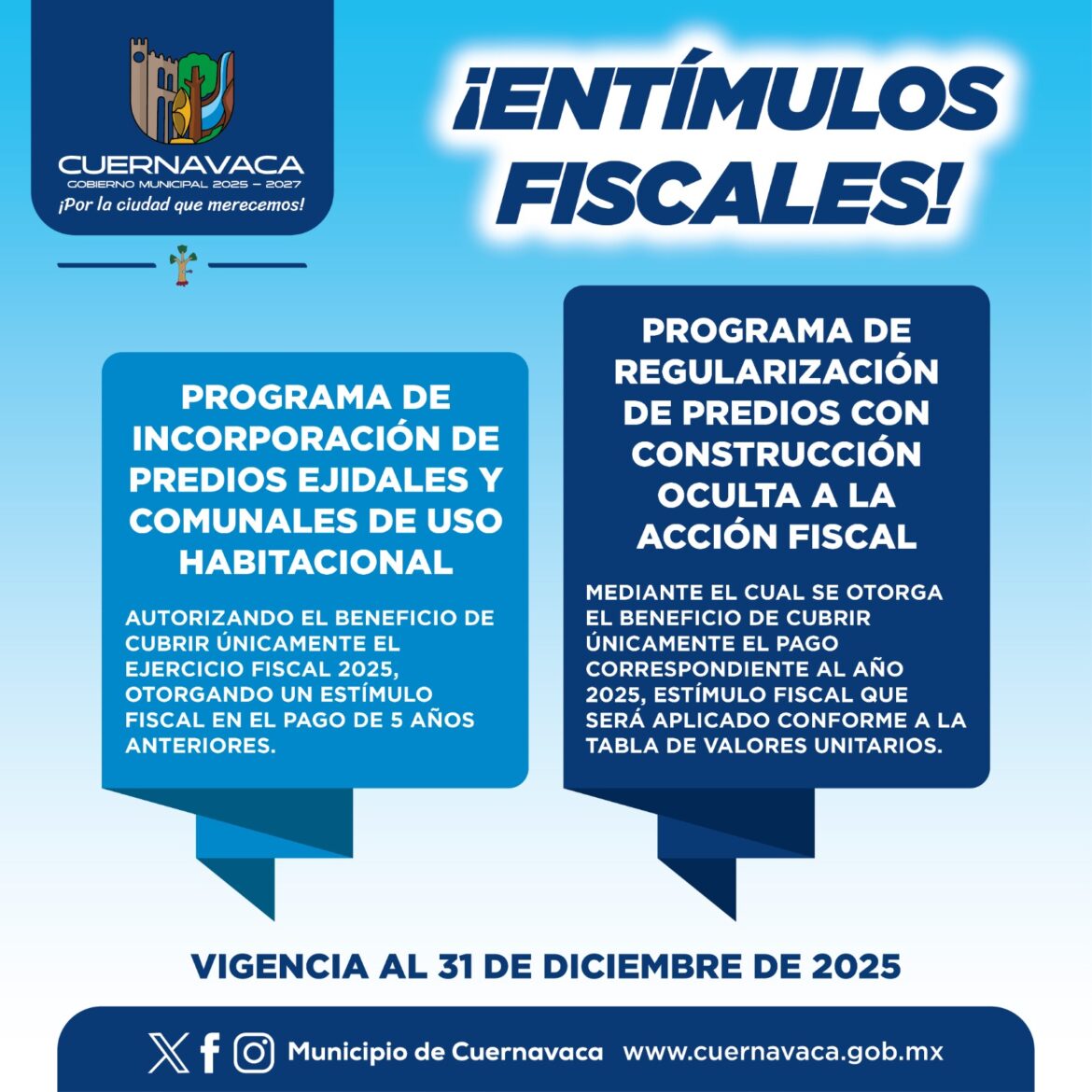 Cabe mencionar que, los estímulos fiscales cuentan con una vigencia hasta el 31 de diciembre de 2025 y para acceder a ellos deben dirigirse a las oficinas de la Dirección de Catastro e Impuesto Predial que se ubican en el edificio de Tesorería Municipal en calle Cuauhtemotzin #4, colonia Centro.