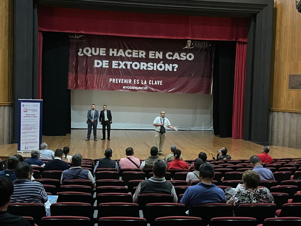 En coordinación con el Ayuntamiento de Cuautla y la Cámara Nacional de Comercio y Servicios Turísticos (Canaco Servitur) de la región oriente, este fin de semana en el teatro Narciso Mendoza, personal de la Unidad Especializada en secuestro y extorsión de la FIDAI, brindó capacitación a empresarios comerciantes y público en general, para conocer los tipos de extorsión, qué hacer o cómo actuar en caso de ser víctimas.