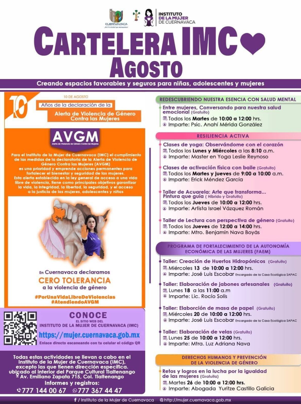 Todos los talleres son gratuitos. Para obtener más información, se puede consultar la página web https://mujer.cuernavaca.gob.mx llamar al teléfono 777 144 00 67 ó enviar un mensaje de WhatsApp al 777 367 44 47.