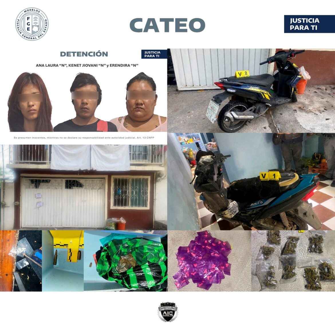 Elementos de la Agencia de Investigación Criminal (AIC) de la Fiscalía Regional Oriente detuvieron a cinco personas, entre ellas dos adolescentes, a quienes les aseguraron bolsas con marihuana y varias presuntas dosis de “cristal”, así como teléfonos celulares y dos motonetas, tras realizar un cateo en un inmueble presuntamente utilizado para la venta de estupefacientes, en el municipio de Ayala.