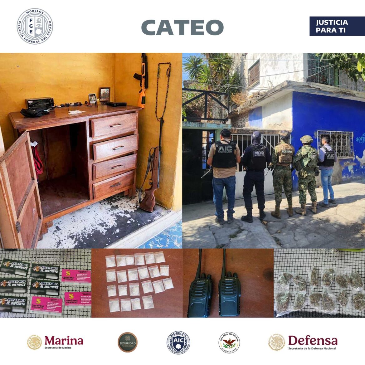 Durante el operativo encabezado por elementos de la AIC se contó con el apoyo de personal de la Secretaría de Marina (Marina), Defensa Nacional (Defensa), Guardia Nacional (GN) y Secretaría de Seguridad y Protección Ciudadana (SSPC) Morelos, quienes intervinieron una vivienda en la colonia Centro.