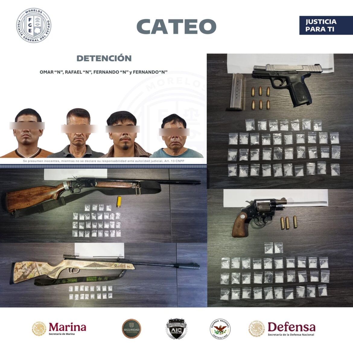 Derivado de una denuncia anónima, personal del Centro de Operaciones Estratégicas (COE) de la Fiscalía Regional Sur Poniente ejecutó una orden de cateo en una vivienda del poblado de Tehuixtla, en Jojutla, en donde detuvo a cuatro personas, aseguró armas e indicios relacionados con la venta de narcóticos.