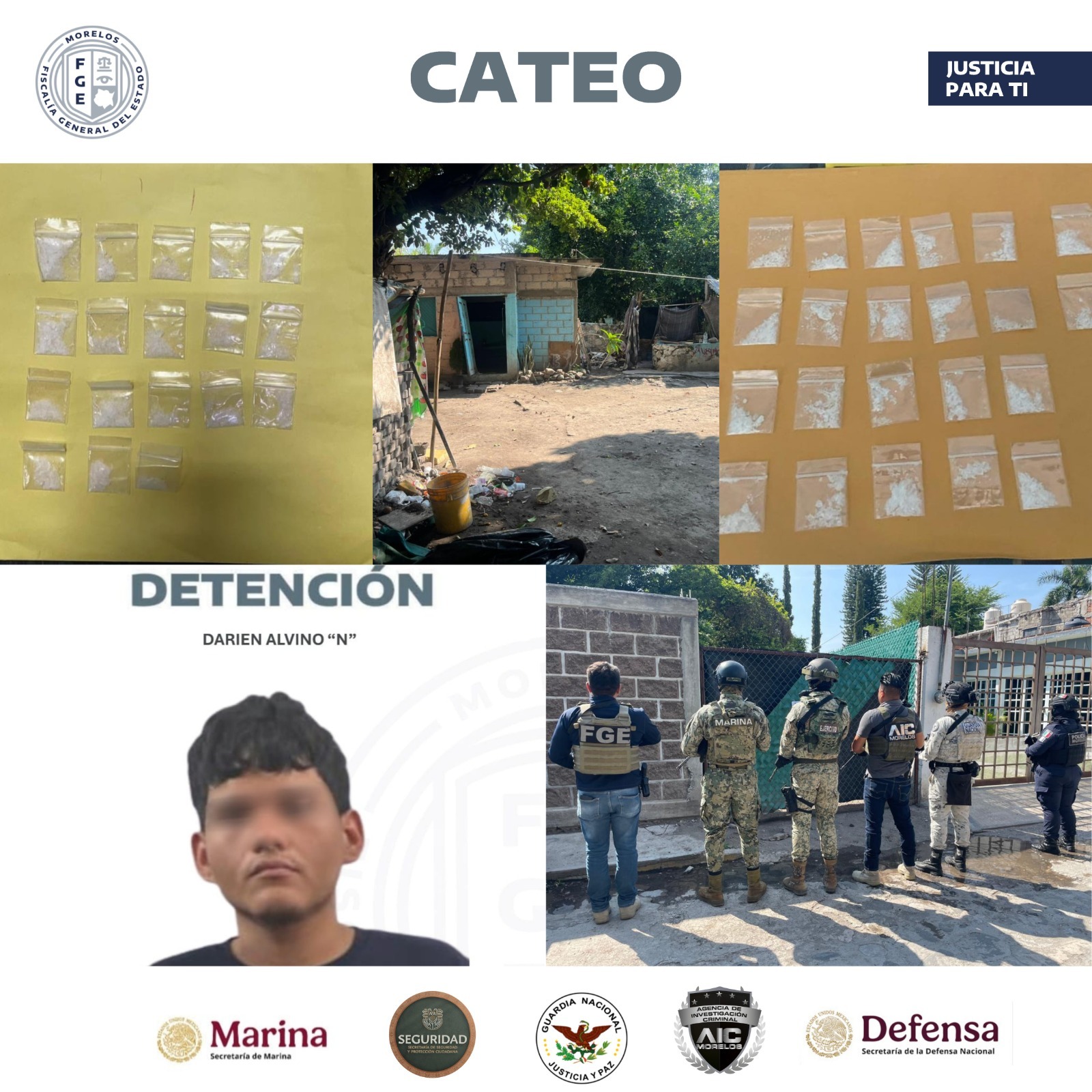 Como resultado del trabajo de inteligencia y de campo, elementos de la Agencia de Investigación Criminal (AIC) de la Fiscalía Regional Sur Poniente detuvieron a un hombre, a quien le aseguraron varias dosis de “cristal”, un cuaderno y una tarjeta bancaria, tras realizar un cateo a una vivienda presuntamente utilizada para la venta de estupefacientes en el municipio de Tlaltizapán.
