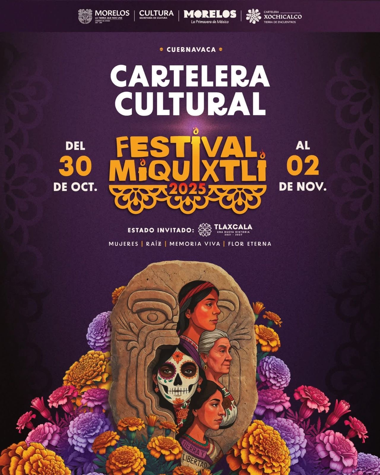 El Gobierno de Morelos, “La tierra que nos une”, a través de la Secretaría de Cultura, invita a la ciudadanía a disfrutar de la trigésima segunda edición del Festival Miquixtli, que se llevará a cabo del 30 de octubre al 02 de noviembre en distintos municipios del estado. Este año, el festival rendirá homenaje a las tradiciones del Día de Muertos con una programación artística que celebra la vida, la memoria y el talento morelense.