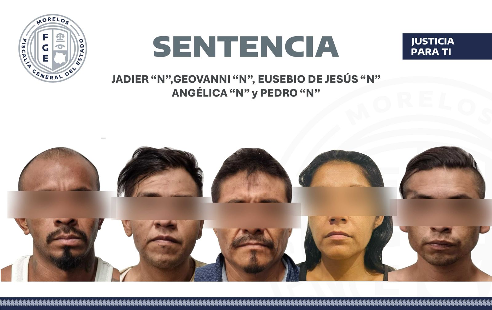 La Fiscalía de Investigación de Delitos de Alto Impacto (FIDAI) obtuvo una sentencia condenatoria de 150 años de prisión en contra de Angélica “N”, Eusebio de Jesús “N”, Geovanni “N”, Jadier “N” y Pedro “N”, quienes fueron encontrados penalmente responsables del secuestro agravado de tres personas, suscitado en el municipio de Emiliano Zapata.
