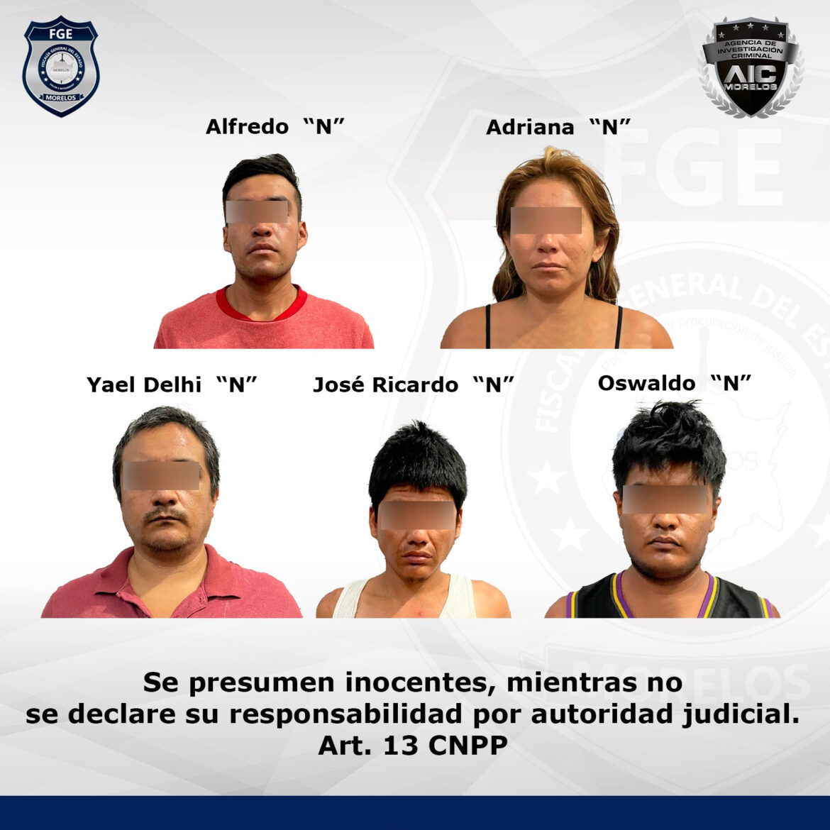 La tarde de este jueves, el personal de la AIC, junto con los miembros de la Defensa, aseguraron de manera flagrante a Alfredo “N”, de 21 años de edad; Oswaldo “N”, de 24 años; José Ricardo “N”, de 24 años; Adriana “N”, de 31 años; y Yael Delhi “N”, alias “Oso”, de 37 años de edad.