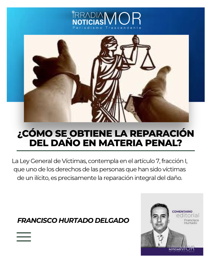 Ahora bien, este derecho se encuentra consagrado en el artículo 36 del Código Penal del estado de Morelos, el cual establece que la reparación de daños y perjuicios comprende la restitución de la cosa obtenida por el delito, y en su caso, el pago del precio de la misma, a valor de reposición según el grado de uso, conservación y deterioro que corresponda; así como la indemnización del daño material y moral, incluyendo el pago de la atención médica que requiera la víctima u ofendido como consecuencia del delito.