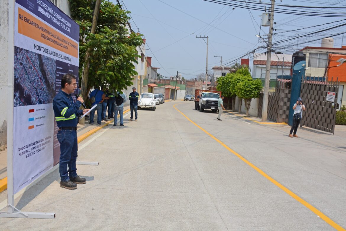 En presencia de vecinos de la colonia Lomas de Tzompantle se llevó a cabo la entrega de la repavimentación con concreto hidráulico de la parte norte de calle Vieja que por años estuvo abandonada y la cual contempló la reparación de la línea de agua potable y nivelación de pozos de visita, entregando con ello una obra integral que garantiza su larga vida útil.