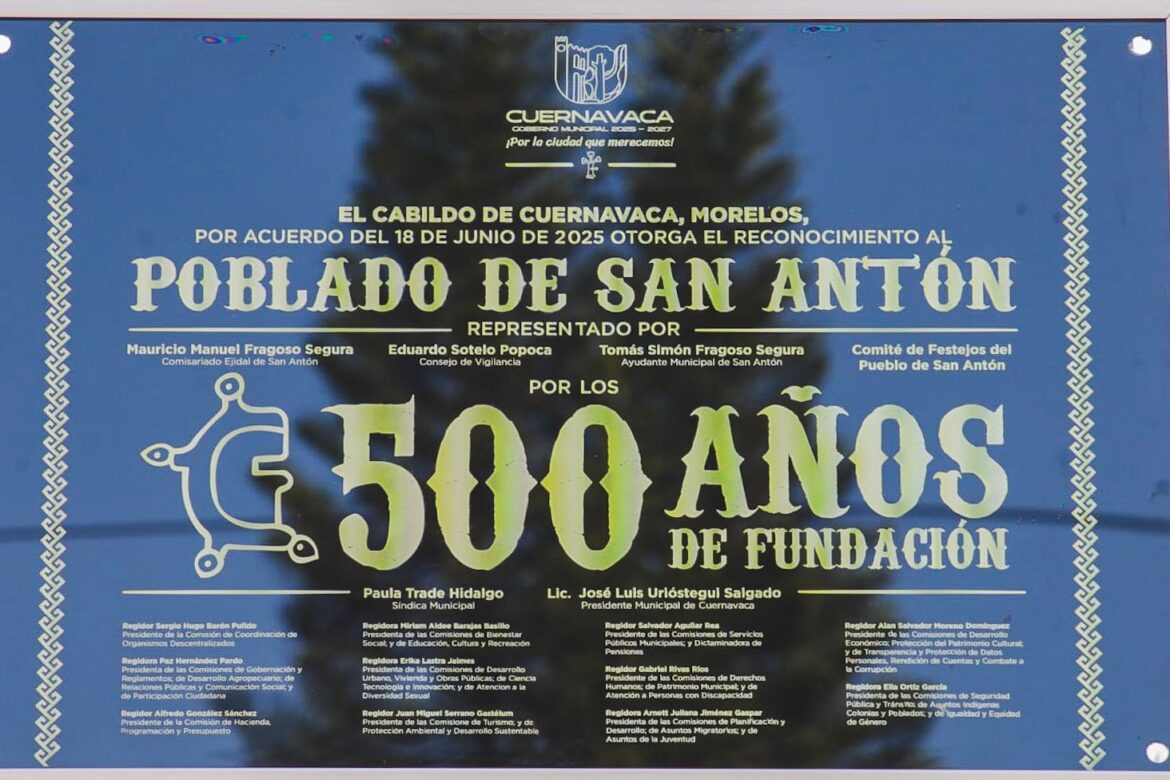 En un acto de reconocimiento a la memoria histórica y a las raíces que dieron origen a la capital morelense, el presidente municipal de Cuernavaca, José Luis Urióstegui Salgado, encabezó la develación de una placa conmemorativa por los 500 años de la fundación del poblado de San Antón, uno de los 12 pueblos originarios del municipio.