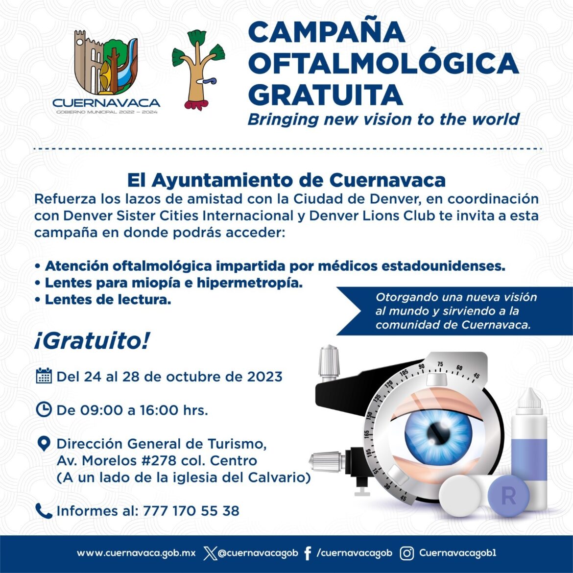 Como parte del hermanamiento que mantiene Cuernavaca desde hace 40 años con Denver Sister Cities International (DSCI), del 24 al 28 de octubre se llevará a cabo en la capital morelense una campaña oftalmológica gratuita que a través de Clubes Rotarios Cuernavaca y el Club de Leones de Denver se estarán donando también de cuatro mil a seis mil lentes para personas que no tienen acceso a servicios médicos especializados en la vista.