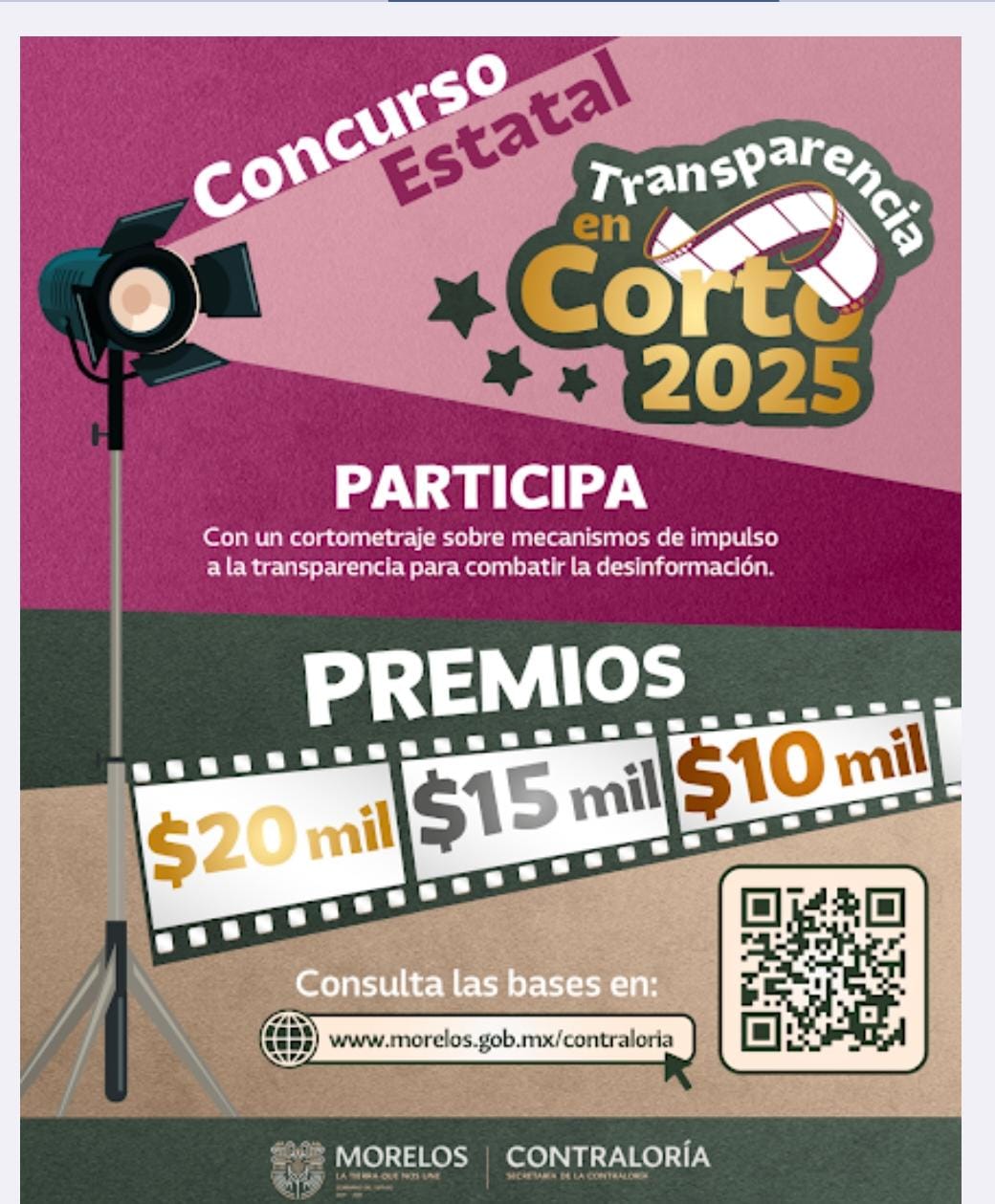 Bajo el lema “Mecanismos de impulso a la transparencia para combatir la desinformación”, el certamen invita a jóvenes morelenses de entre 15 y 25 años de edad, a crear cortometrajes originales que promuevan valores como la rendición de cuentas, el acceso a la información y el pensamiento crítico, a través de formatos audiovisuales accesibles y creativos.