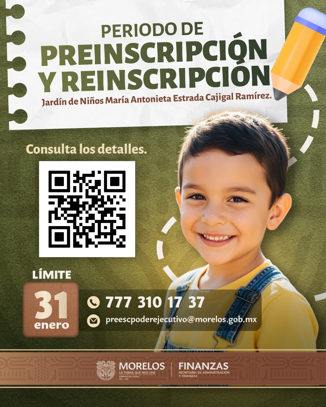 La Secretaría de Administración y Finanzas, encabezada por Jorge Salazar Acosta, a través del Jardín de Niños María Antonieta Estrada Cajigal Ramírez, adscrito al Poder Ejecutivo, convoca a las y los servidores públicos a participar en el periodo de preinscripción y reinscripción para el próximo ciclo escolar.