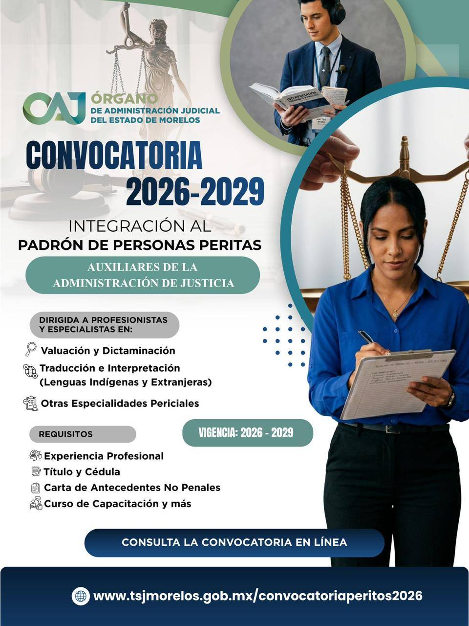 El Órgano de Administración Judicial del Poder Judicial del Estado de Morelos lanzó la convocatoria para integrar el padrón de personas que desempeñan la función pericial como auxiliares de la administración de justicia, correspondiente al periodo 2026–2029.