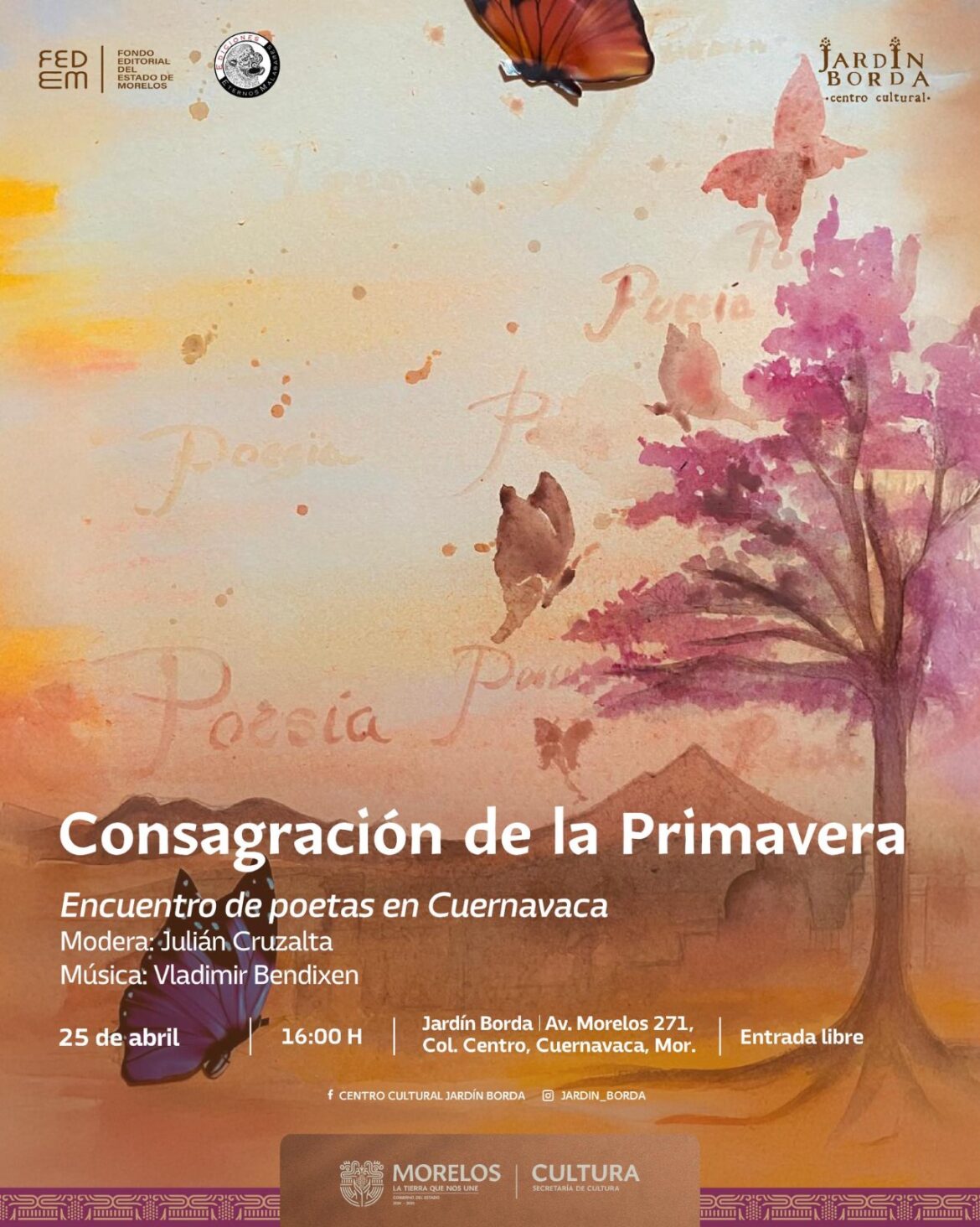 En el marco de las acciones para fomentar el arte y la literatura, la Secretaría de Cultura del Estado de Morelos invita a la ciudadanía a “La Consagración de la Primavera: Encuentro de Poetas en Cuernavaca”, que se llevará a cabo el próximo viernes 25 de abril a las 16:00 horas, en la emblemática Sala Manuel M. Ponce del Centro Cultural Jardín Borda.