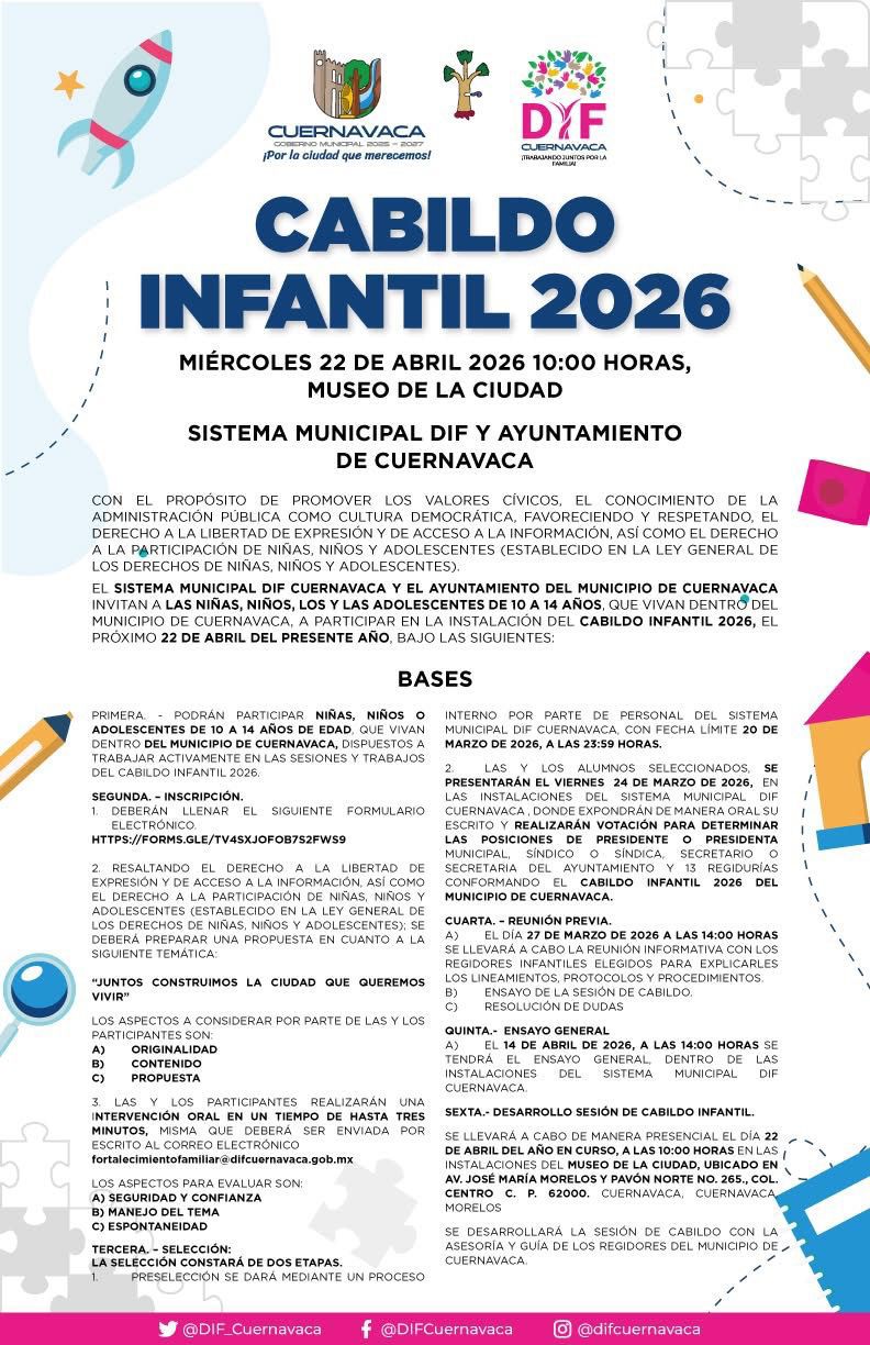 El Ayuntamiento de Cuernavaca, encabezado por el alcalde José Luis Urióstegui Salgado, invita a niñas, niños y adolescentes a convertirse en protagonistas de las decisiones de su ciudad participando en el Cabildo Infantil 2026, que se realizará el próximo 22 de abril a las 10:00 horas, en el Museo de la Ciudad de Cuernavaca (MuCiC).