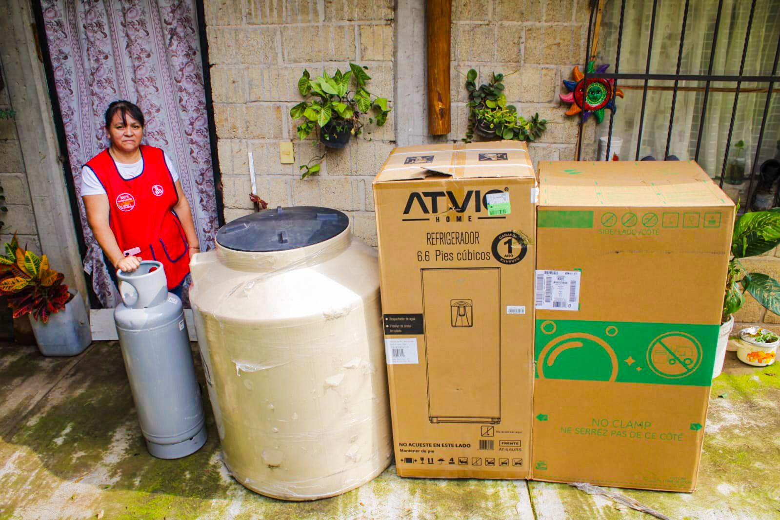 Entre los apoyos entregados se incluyeron camas, colchones, juegos de sábanas, cobijas, estufas, refrigeradores, frigobares, lavadoras, salas, comedores, almohadas, roperos pequeños, tinacos y tanques de gas, conforme a las necesidades específicas de cada familia.