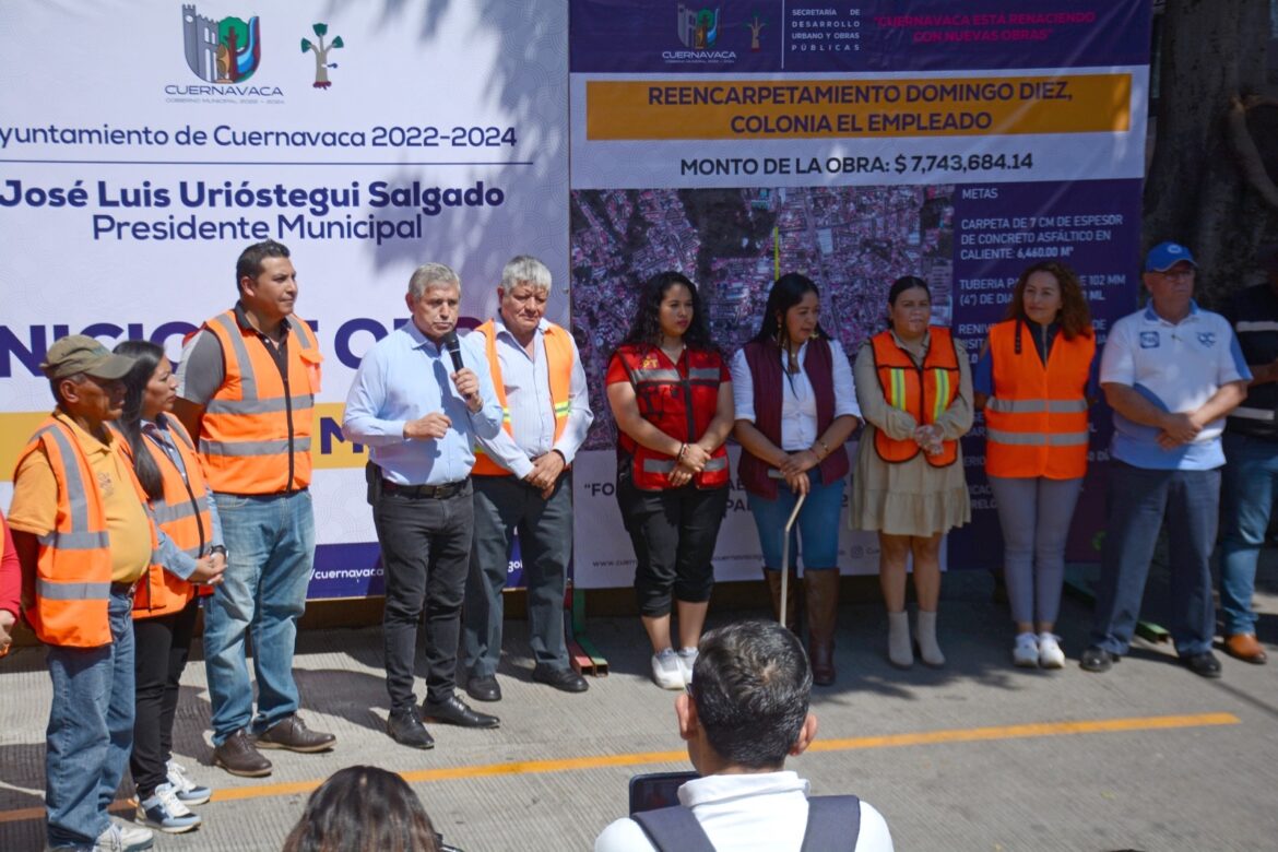 Cumpliendo el programa de rescate de las vialidades principales de Cuernavaca, a fin de hacerlas más seguras y transitables para todos los tipos de movilidad, el presidente municipal, José Luis Urióstegui Salgado, encabezó este lunes el arranque de la obra de reencarpetamiento de la avenida Domingo Diez en la colonia El Empleado que con una inversión de siete millones 743 mil 684.14 pesos del Fondo de Infraestructura Regional Municipal 2023 creado por el Congreso de Morelos contempla la sustitución de líneas de agua potable y 140 tomas domiciliarias.