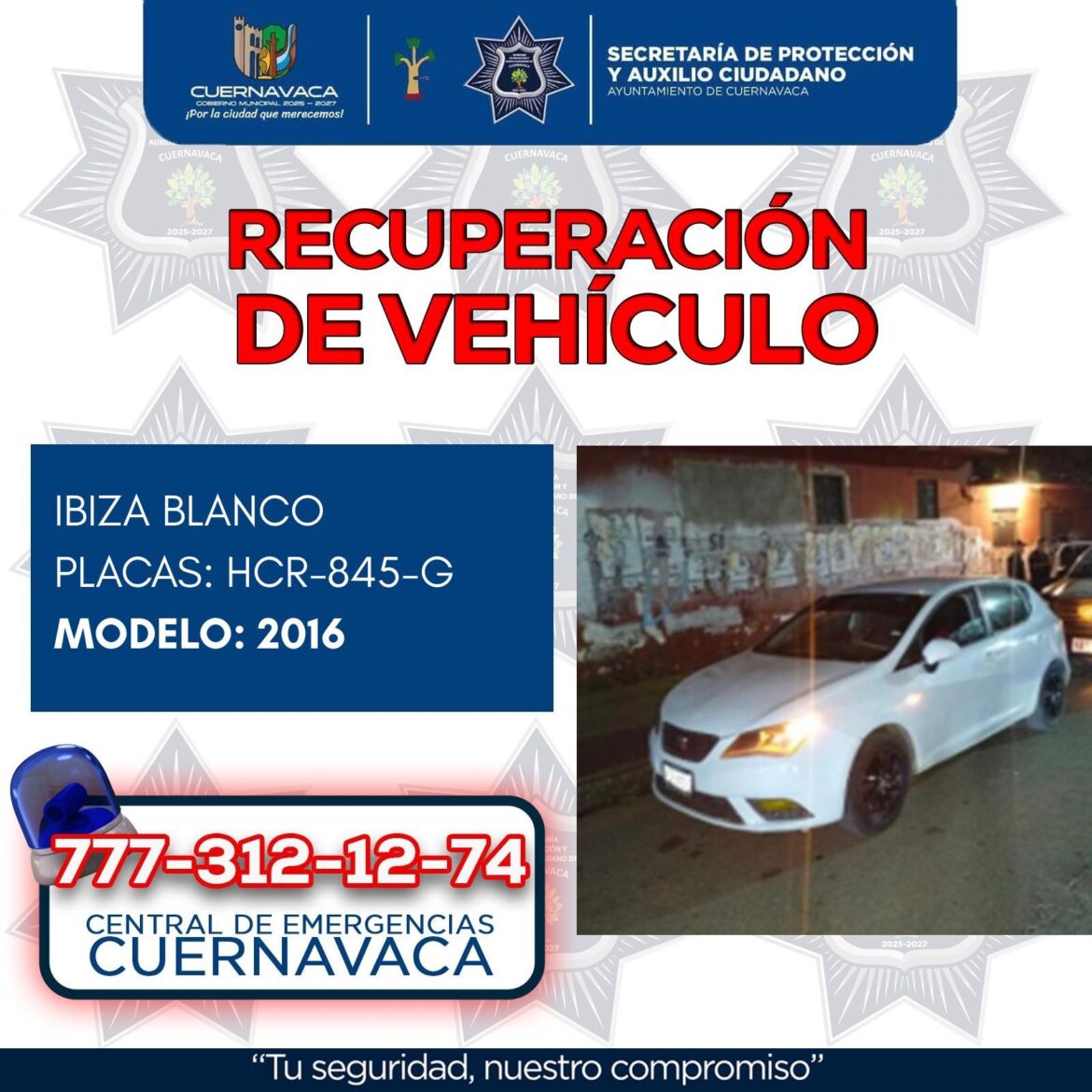 En cuanto a la recuperación de vehículos, como resultado de los operativos de vigilancia y prevención del delito en Cuernavaca, la SEPRAC recuperó, entre otros, un vehículo Ibiza color blanco, modelo 2016, con placas HCR845G y número de serie VSSAB46J1GR021983, reportado como robado en la colonia Chamilpa.