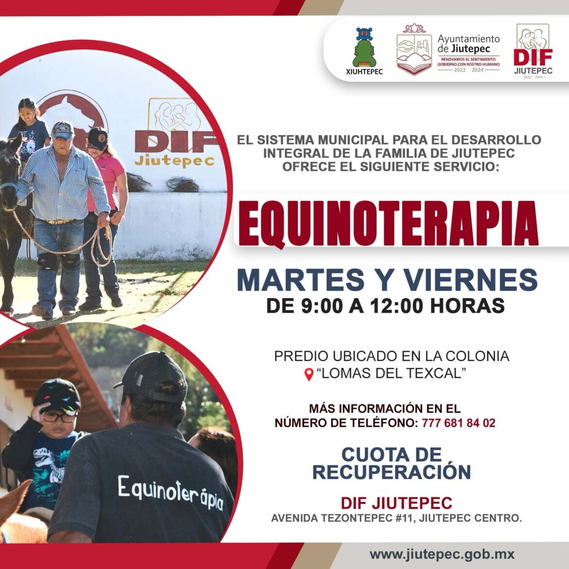 El Sistema para el Desarrollo Integral de la Familia (DIF) Jiutepec ofrece sesiones de equinoterapia, los días martes y viernes de las 9:00 a las 12:00 horas, las cuales están destinadas a procurar la salud mental y física de niñas, niños, así como jóvenes del municipio.