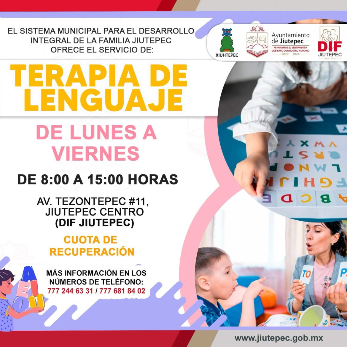 El Sistema para el Desarrollo Integral de la Familia (DIF) Jiutepec ofrece terapias de lenguaje, para niñas y niños del municipio, con el objetivo de contribuir a mejorar la calidad de vida de la población infantil de quienes presentan problemas para comunicarse.