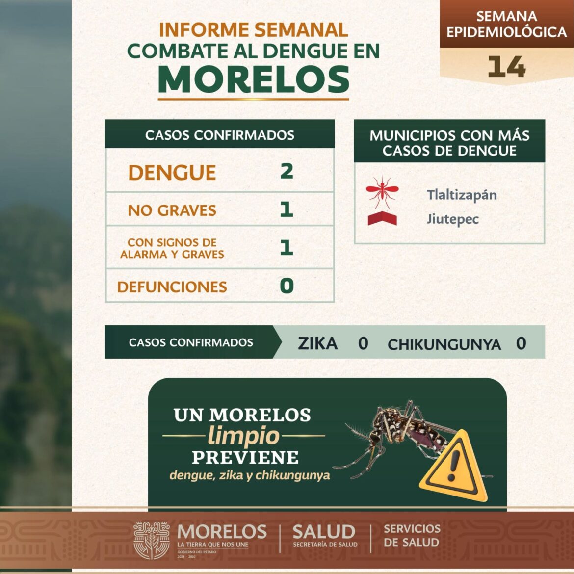 La Secretaría de Salud, a través de Servicios de Salud de Morelos (SSM), exhorta a la población morelense a mantener las medidas de prevención y evitar la proliferación de criaderos del mosquito transmisor del Dengue.